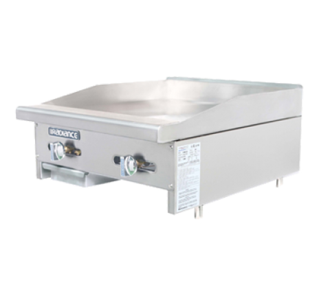 Radiance Griddle, countertop, gas, 24"W x 30"D, stainless steel front & side, built-in stainless steel splash guard, 3/4" thick highly polished steel griddle plate, (2) burner, aluminized U shaped burners & manual controls for every 12", individual heat resistant on-off knob, 3" wide front grease trough, removable grease pan, bullnose stainless steel front extension, 2" stainless steel standard legs, regulator included, total 44,000 BTU, CSA, CSA-Sanitation