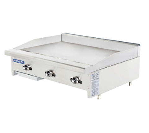Radiance Griddle, countertop, gas, 36"W x 30"D, stainless steel front & side, built-in stainless steel splash guard, 1" thick highly polished steel griddle plate, (3) burner, aluminized U shaped burners & thermostat controls for every 12", 3" wide front grease trough, removable grease pan, bullnose stainless steel front extension, 2" stainless steel standard legs, regulator included, total 66,000 BTU, CSA, CSA-Sanitation