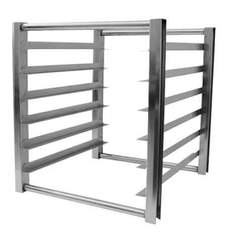 Half Size Pan Rack, 21"W x 24"D x 22-1/2"H, fits in pizza prep or solid door refrigerators & freezers, 304 stainless steel construction, resists corrosion in high moisture refrigerated environments, (6) full size pan (18"x26") capacity, KD