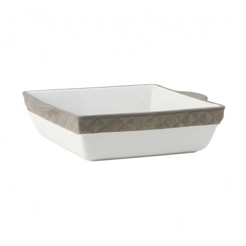 Casserole Dish, 3-1/4 qt., 12"L x 10"W x 3"H (10"L without handle), square, without lid, embossed, microwave & dishwasher safe, oven proof, fully vitrified, lead-free, DisplayTux®©, Porcelain White with Black Truffle Band