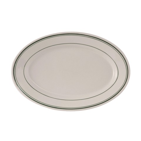 Platter, 13-1/2" x 9", oval, wide rim, rolled edge, microwave & dishwasher safe, oven proof, fully vitrified, lead-free, ceramic, Green Bay, American White/Eggshell with Green Band