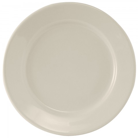 Plate, 13-1/8" dia., round, wide rim, rolled edge, microwave & dishwasher safe, oven proof, fully vitrified, lead-free, ceramic, Reno, American White/Eggshell