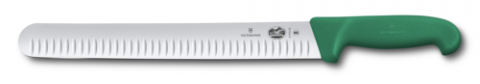 Slicer Knife, 12" wide blade, 1-1/4" width at handle, granton edge, green Fibrox® nylon handle, slip resistant, NSF