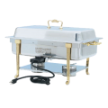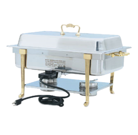 Classic Design Full-Size Brass Trim, 9 quart, electric chafer, stainless, mirror finish, LONG SIDE PLUG-IN, UL, complete with brass trim rack, dripless water pan, 2-1/2" SPV food pan, dome cover, & (2) fuel holders, USA (Refer to vollrathfoodservice.com for full warranty policy)
