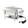 Classic Design Full-Size Brass Trim, 9 quart, electric chafer, stainless, mirror finish, SHORT END PLUG-IN, UL, complete with brass trim rack, dripless water pan, 2-1/2" SPVfood pan, dome cover, & (2) fuel holders, USA (Refer to vollrathfoodservice.com for full warranty policy)