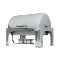 New York, New York® Oblong, Roll Top, 9 quart, Chafer, stainless, brilliant mirror finish, with brass accent on cover knobs & tap handle, includes stainless rack, water pan, 2-1/2" SPV food pan, vented removable Roll Top dome cover opens to the 90°, (2) fuel holders, imported (Refer to vollrathfoodservice.com for full warranty policy)