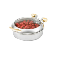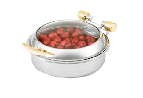 Intrigue® Glass Top Induction Chafer, large, round, 6 quart (5.8L), mirror finish 18-8 stainless with brass trim, mirror finish 18-0 stainless food & low profile stainless water pan, features removable glass lid with brass trim, baffle hinge accommodates cover in closed, 45° or 90° position, reinforced bracket with rubber table feet, 15-1/2" x 3-5/32", imported (Refer to vollrathfoodservice.com for full warranty policy)