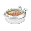Intrigue® Glass Top Induction Chafer, large, round, 6 quart (5.8L), mirror finish 18-8 stainless with stainless trim, mirror finish 18-0 stainless food & low profile stainless water pan, features removable glass lid with stainless trim, baffle hinge accommodates cover in closed, 45° or 90° position, reinforced bracket with rubber table feet, 15-1/2" x 3-5/32", imported (Refer to vollrathfoodservice.com for full warranty policy)