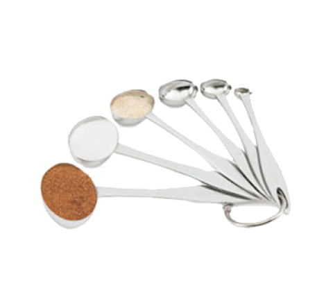 Six-Piece Oval Measuring Spoon Set, 18/8 stainless steel, unique oval bowl design, capacities stamped on product, set secured with stainless steel ring, includes (1) Tbsp (15 ml), (1) 2 tsp (10 ml), (1) tsp (5 ml), (1) 1/2 tsp (2.5 ml), (1) 1/4 tsp (1.25 ml), (1) 1/8 tsp (.625 ml), imported (Refer to vollrathfoodservice.com for full warranty policy)