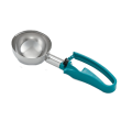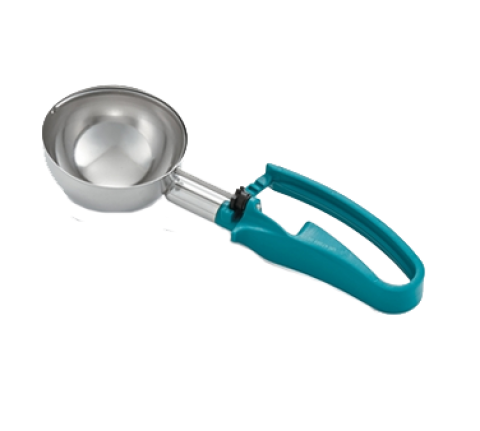 Disher, standard length, 6 oz., size 5, 3-3/8" dia., one-piece, two-part construction, stainless steel scoop & shaft, teal color-coded 6-3/8" long ergonomic plastic handle, designed for left or right-handed users, not recommended for use with ice cream or hard products, NSF (Refer to vollrathfoodservice.com for full warranty policy)