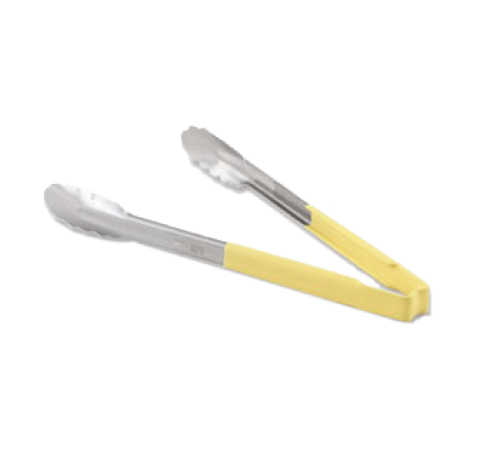 Utility Tongs, one-piece, 9-1/2" (24.1 cm), scalloped teeth, springless design, yellow ergonomic antimicrobial Kool-Touch® handle (heat resistant to 225°F (107.2°C), fully functional to 350° F (176.6 C), dishwasher safe, stainless steel, NSF, Made in USA, Jacob's Pride® Collection, Limited Lifetime Warranty (Refer to vollrathfoodservice.com for full warranty policy)