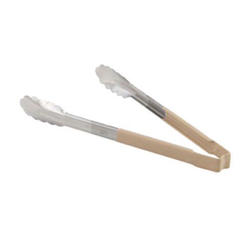 Utility Tongs, one-piece, 9-1/2" (24.1 cm), scalloped teeth, springless design, ivory ergonomic antimicrobial Kool-Touch® handle (heat resistant to 225°F (107.2°C), fully functional to 350° F (176.6 C), dishwasher safe, stainless steel, NSF, Made in USA, Jacob's Pride® Collection, Limited Lifetime Warranty (Refer to vollrathfoodservice.com for full warranty policy)