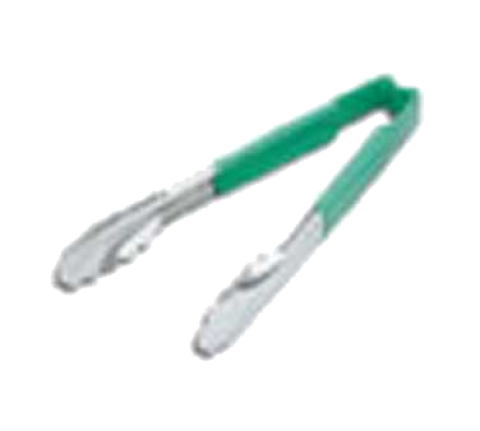 Utility Tongs, one-piece, 12" (30.5 cm), scalloped teeth, springless design, green ergonomic antimicrobial Kool-Touch® handle (heat resistant to 225°F (107.2°C), fully functional to 350° F (176.6 C), dishwasher safe, stainless steel, NSF, Made in USA, Jacob's Pride® Collection, Limited Lifetime Warranty (Refer to vollrathfoodservice.com for full warranty policy)