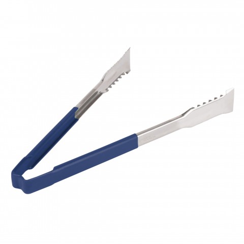 VersaGrip™ Tongs, one-piece, 12" (30.5 cm), flattened ends, gripper teeth, springless design, blue ergonomic antimicrobial Kool-Touch® handle (heat resistant to 225°F (107.2°C), fully functional to 350° F (176.6 C), dishwasher safe, stainless steel, NSF, Made in USA, Jacob's Pride® Collection, Limited Lifetime Warranty (Refer to vollrathfoodservice.com for full warranty policy)