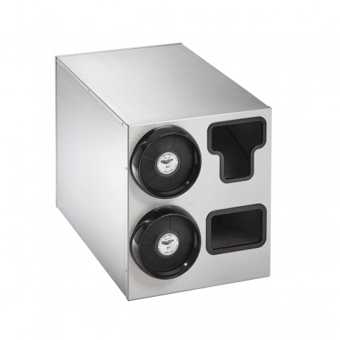 Cup Dispenser, vertical, countertop, (2) high, 14-1/4"W x 23-1/4”D x 16-3/8"H, accommodates (2) sleeves of cups (rim diameters 2-1/4" – 4-3/4”), (1) "T" lid holder & (1) straw pocket, includes: (2) INC-80, stainless steel (made to order) (Refer to vollrathfoodservice.com for full warranty policy)