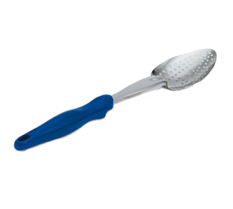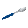 Ergo Grip™ Heavy Duty Spoon, blue nylon ergonomic handle, equipped with all-natural antimicrobial, perforated, 13-13/16", heavy gauge 18/8 stainless steel, high temp 450° F (232° C), textured surface handle with built in stopper notch, NSF, imported, Jacob's Pride® Collection, Limited Lifetime Warranty (Refer to vollrathfoodservice.com for full warranty policy)