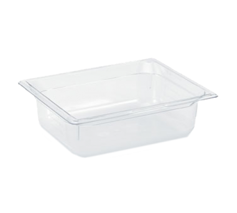 Super Pan® 1/2 GN Food Pan, 4" deep, low-temp polycarbonate clear plastic, top flange corners with concave indention, anti-jamming, ramped sides, reverse form flattened edge, framing shoulder, interchanges with SPV stainless steel pan line, NSF, meets gastronorm (EN 631-1) standard, Made in USA (Refer to vollrathfoodservice.com for full warranty policy)