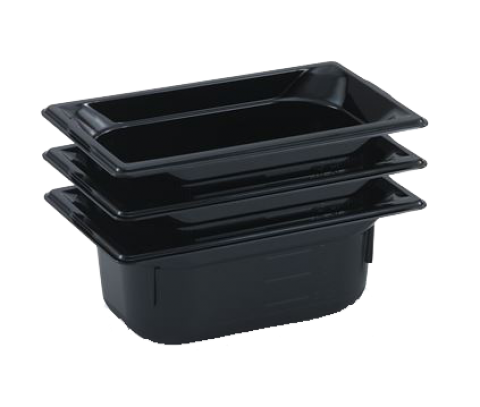 Super Pan® 1/4 GN Food Pan, 4" deep, low-temp polycarbonate black plastic, top flange corners with concave indention, anti-jamming, ramped sides, reverse form flattened edge, framing shoulder, interchanges with SPV stainless steel pan line, NSF, meets gastronorm (EN 631-1) standard (Refer to vollrathfoodservice.com for full warranty policy)