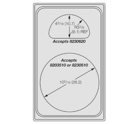 Miramar™ Template, for (1) casserole & (1) half oval decorative pans, plain stainless, accommodates (1) 8203510 or (1) 8230510 & (1) 8230620 pans, durable 12 gauge stainless, for hot or cold applications, dishwasher safe, underside integral rib design for extra strength & securing template in well, fits all standard 12" x 20" hot/cold wells, warmers & chafers, NSF, Made in USA (contact Vollrath for lead time), made to order, cannot be cancelled or returned (Refer to vollrathfoodservice.com for full warranty policy)