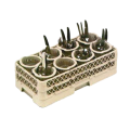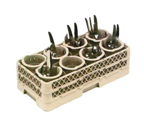 Traex® Dishwasher Flatware Rack, half-size, includes: (1) half size flatware rack, 10"W x 19-3/4"D x 5-9/16"H, handle on all four sides & (8) flatware cylinders, 4-1/2" diameter x 5-5/8"H, (1370) co-polymer plastic, beige, NSF, Made in USA (Refer to vollrathfoodservice.com for full warranty policy)