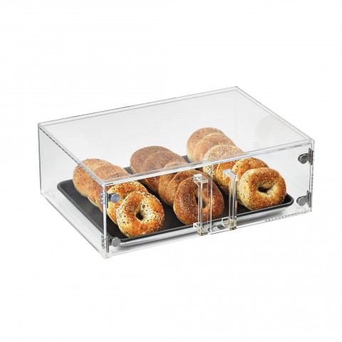 Cubic Acrylic Display System,10"W x 14"D x 7-3/8"H, includes: (1) 1/2 size clear acrylic display bin with (2) front doors, (1) 1/4 non stick sheet pan # 5220NS, (4) reusable chalk labels & (1) box of chalk, NSF (Refer to vollrathfoodservice.com for full warranty policy)