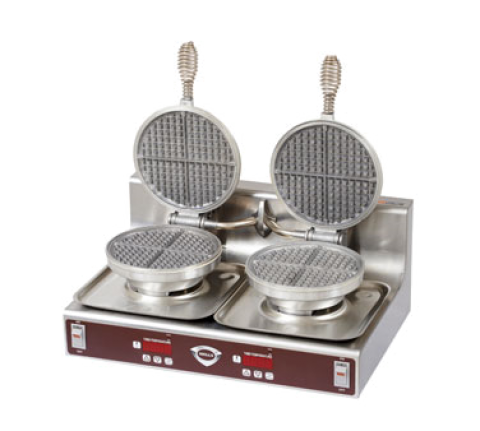Waffle Baker, dual round waffle grid, cast aluminum grids, user-adjustable digital time/temp controls, audible alarm, stainless steel construction, cULus