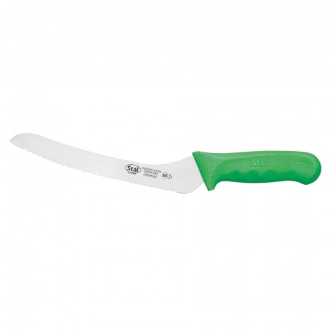 Bread Knife, 14-1/4" O.A.L., 9" blade, offset, stamped, high carbon, no-stain German steel, polypropylene handle, Stal, green, NSF (Qty Break = 6 each)