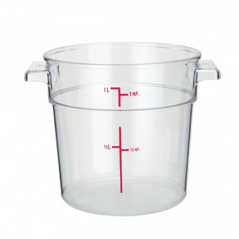 Food Storage Container, 1 qt., 5-1/8" x 6-3/8" x 4-7/8"H, round, stackable, temperature range: -40°F to 210°F, built-in handles, graduation markings in quarts & liters, dishwasher safe, polycarbonate, clear, NSF (Qty Break = 12 each)