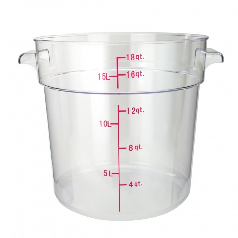 Food Storage Container, 18 qt., 12-1/4" x 14-1/8" x 12"H, round, stackable, temperature range: -40°F to 210°F, built-in handles, graduation markings in quarts & liters, dishwasher safe, polycarbonate, clear, NSF (Qty Break = 6 each)