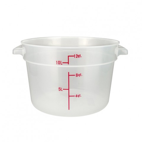 Storage Container, 12 qt., 12.25" x 14.06" x 8.44"H, round, temperature range: -40°F to 160°F, with built-in handles, graduation markings in quarts & liters, stain resistant, dishwasher safe, BPA free, polypropylene, translucent, NSF (Qty Break = 12 each)