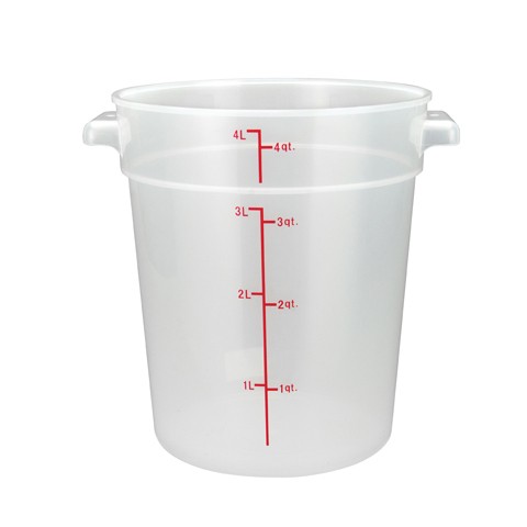 Storage Container, 4 qt., 7.31" x 8.5" x 8.44"H, round, temperature range: -40°F to 160°F, with built-in handles, graduation markings in quarts & liters, stain resistant, dishwasher safe, BPA free, polypropylene, translucent, NSF (Qty Break = 12 each)