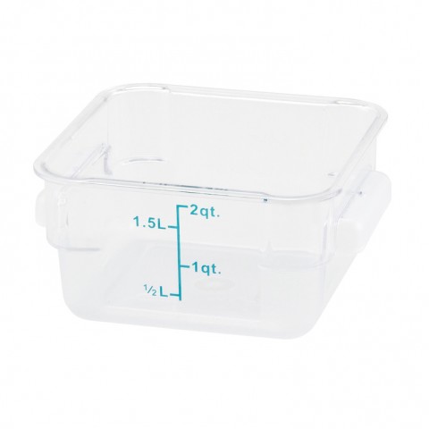 Storage Container, 2 qt., 7-1/16" x 7-11/16" x 3-1/4"H, square, built-in handles, graduation markings in quarts & liters, temperature range: -40°F to 160°F, stain resistant, dishwasher safe, BPA free, polypropylene, translucent, NSF (Qty Break = 12 each)