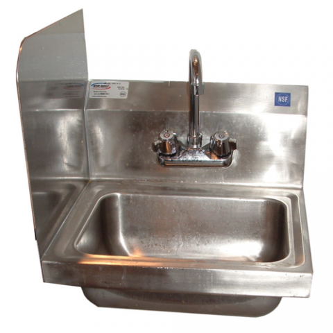 Hand sink, wall mount, left welded sidesplash, 20 gauge stainless steel, 5" deep, 9.5" backsplash, 4" gooseneck faucet, 1.5" basket drain, 10" x 14" x 5" bowl size, 17"L x 15"W sink dimensions, NSF.