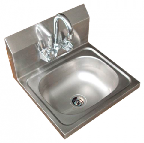 Hand sink, wall mount, 20 gauge stainless steel, 5" deep, 9.5" backsplash, 4" gooseneck faucet, 1.5" basket drain, 10" x 14" x 5" bowl size, 17"L x 15"W sink dimensions, NSF