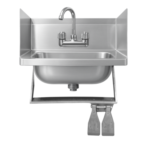 Hand Sink, wall mount with sidesplash & knee valve, 17"L x 15"W, 10"W x 14"L x 5"D bowl dimensions, 4" gooseneck faucet, basket drain, 20 gauge, 9.5" backsplash with (2) sidesplashes, stainless steel, NSF
