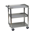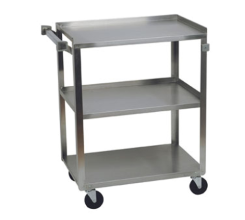 Focus Foodservice - Utility Cart, 300 lb. weight capacity, (3) 15-1/2" x 24" solid shelves with hemmed front edge, 11-3/4" clearance, open base, push handle, bumpers on legs and handle, all welded construction, stainless steel, (4) 3-1/2" all swivel casters, NSF (shippable via UPS or FedEx)