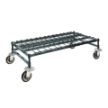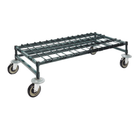 Focus Foodservice - Dunnage Rack, mobile, weight capacity 800 lbs., with wire mat, 18" x 36" x 12-1/2"H, (3) sided frame, (4) 7" posts, for wet or dry storage, (4) 5" polyurethane casters: (2) with brake and (2) swivel only, (4) 5" revolving donut bumpers, green epoxy finish, NSF