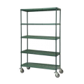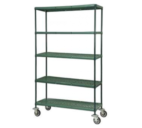 Focus Foodservice - FPS-Plus™ Mobile Shelving Carts, 1000 lbs. weight capacity, for wet or dry storage, includes: (5) shelf, 18"W x 48"L, epoxy coated frame, with vented mat, Sanigard™ anti-microbial protection, (4) 63" mobile post, (4) 5" polyurethane swivel casters (2 with brake), (4) bumpers, green, NSF