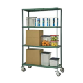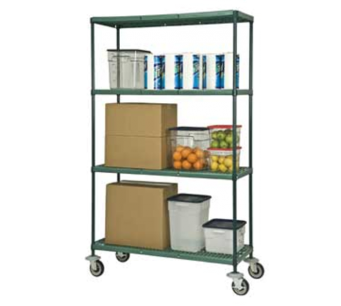 Focus Foodservice - FPS-Plus™ Mobile Shelving Carts, 1000 lbs. weight capacity, for wet or dry storage, includes: (4) shelf, 18"W x 60"L, epoxy coated frame, with vented mat, Sanigard™ anti-microbial protection, (4) 63" mobile post, (4) 5" polyurethane swivel casters (2 with brake), (4) bumpers, green, NSF