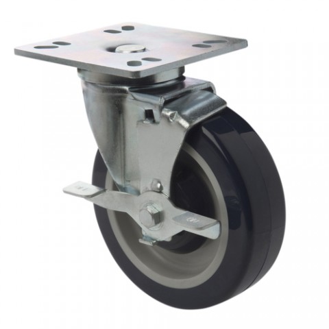 Focus Foodservice - Universal Caster Set, mounting plate: heavy-duty, 4" (10.2 cm), square, multiple bolt holes, stainless steel, wheels: (4) 5" (12.7 cm), with brakes, grease resistant, non-marking, 300 lb. (227 kg) capacity per caster, polyurethane, temperature range 14° to 212° F (-10° to 100°C), NSF (set of 4) (mounting hardware not included)