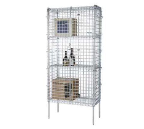 Focus Foodservice - Security Cage Complete Stationary Kit, 18" x 48" shelves with 63"H panels, for dry storage, includes: (1) top shelf, (1) middle shelf, (1) bottom shelf, (2) front panels, (2) side panels, (2) back panels and assembly hardware, (4) 74" posts, (4) zinc plated leveling feet, chromate, NSF