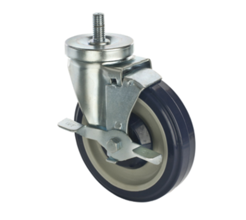 Focus Foodservice - Universal Threaded Stem Caster Set - 5" dia., 1/2" X 13, 1" long thread, all swivel, (2) with brakes, adds 6"H to unit, 250 lb. load capacity per caster, grease resistant, polyurethane wheels, NSF (set of 4)