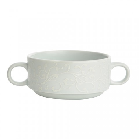 Oneida® - Bouillon, 9-1/2 oz., 6", round, stackable, with (2) handles, embossed paisley design, glazed, porcelain, bright white, Luzerne, Ivy Flourish (Fits L5803050500) (must be purchased in case quantities) (limited lifetime warranty contact factory for details) (Special order item, contact factory for more details)