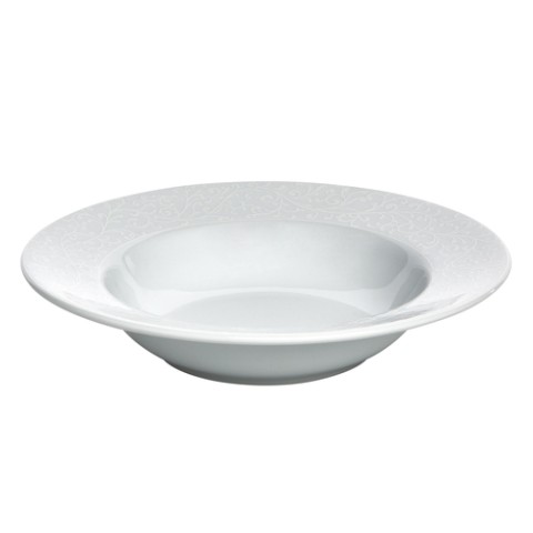 Oneida® - Soup Bowl, 9-1/2 oz., 8-3/4" dia., round, wide rim, embossed paisley design, glazed, porcelain, bright white, Luzerne, Ivy Flourish (must be purchased in case quantities) (limited lifetime warranty contact factory for details) (Special order item, contact factory for more details)