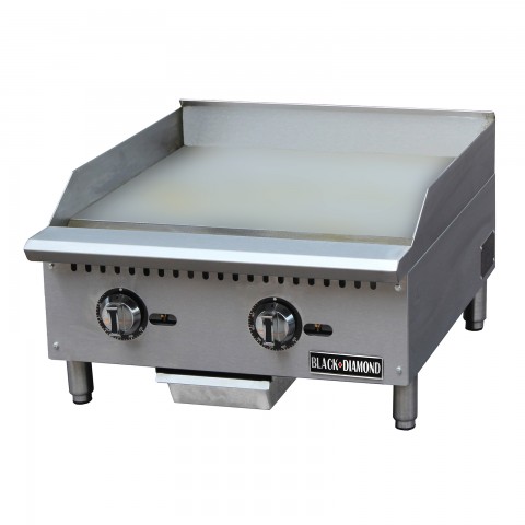 Black Diamond Thermostatic Gas Griddle, countertop, 23-3/4"W x 22"D, 1" thick smooth steel plate, (2) thermostatic burner controls (adjustable from 200°- 450°), stainless steel drip tray, stainless steel front and sides, with splash guards, grease trough, adjustable legs, field convertible to LPG-L.P orifices, 60,000 BTU, 3/4" rear NPT, cETLus, ETL-Sanitation