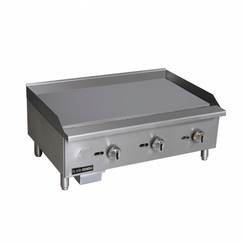 Black Diamond Gas Griddle, countertop, 36"W x 22-3/4"D, 5/8" thick smooth steel plate, (3) manual burner control, stainless steel drip tray, stainless steel front and sides, splash guards, grease trough, adjustable legs, includes tips for field conversion to LPG, 90,000 BTU, 3/4" rear NPT, cETLus, ETL-Sanitation