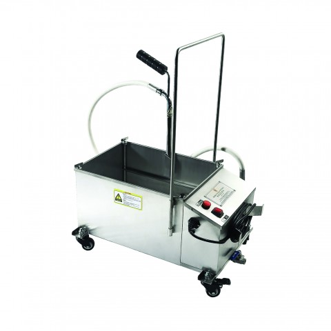 Oil Filtration System, portable, 18" x 13" chamber, 75 lbs of oil capacity, pumps up to 1.32 gallons of oil per minute, 10.6 gallon capacity filtering chamber, 5' removable flexible filtering hose with stainless steel nozzle, stainless steel gasket, filter mesh and rubber gasket, fold-down handle, low profile, stainless steel cover, separate on/off power switch, start/stop pump button, (4) swivel casters (2 locking), stainless steel construction, includes stainless steel gasket, includes filter papers, filter powder, 120v/60/1-ph, 300 watts, 1/3 HP, NEMA 5-15P, CE