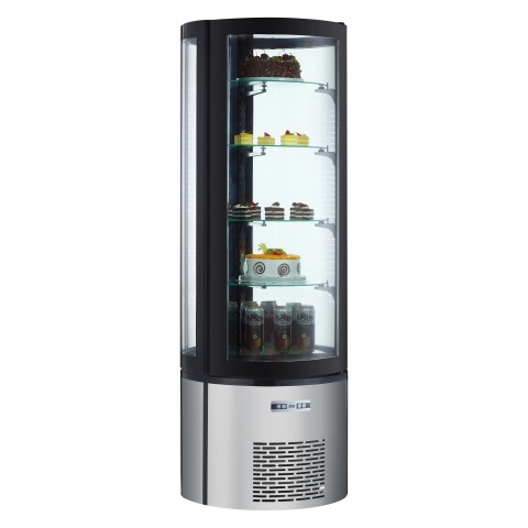 Black Diamond Refrigerated Cake Display Case, floor standing, 26-4/5"W, 12.7 cu. ft. capacity, bottom mount self-contained refrigeration, 35° to 46°F temperature range, digital temperature control & display, automatic defrost, (1) glass hinged door, (4) glass shelves, LED lighting, curved double tempered side glass, stainless steel base, (5) casters with front (2) brakes, R290, 110v/60/1-ph, 3.5 amps, CE