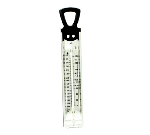 Deep Fry/Candy Display Thermometer, 100° to 400°F and 50° to 200°C, 11-3/4"L x 2"W, adjustable clip, stay-cool handle, glass tube, stainless steel case, black molded-plastic