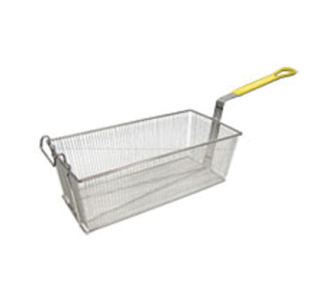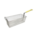 Fry Basket, 17" x 8-1/4" x 6" deep, front hook, one wire construction, nickel plated, yellow coated handle